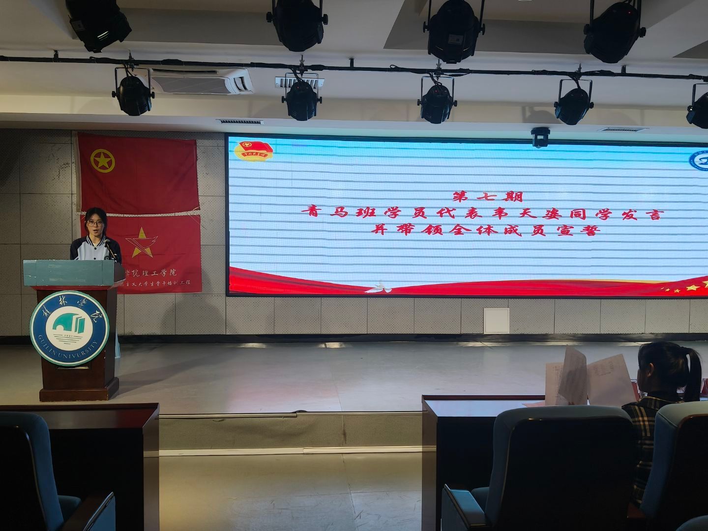 青马班学员代表韦天姿分享自己对青马班的理解与入班感想,并带领全体成员宣誓,表达对马克思主义的坚定信仰的承诺。