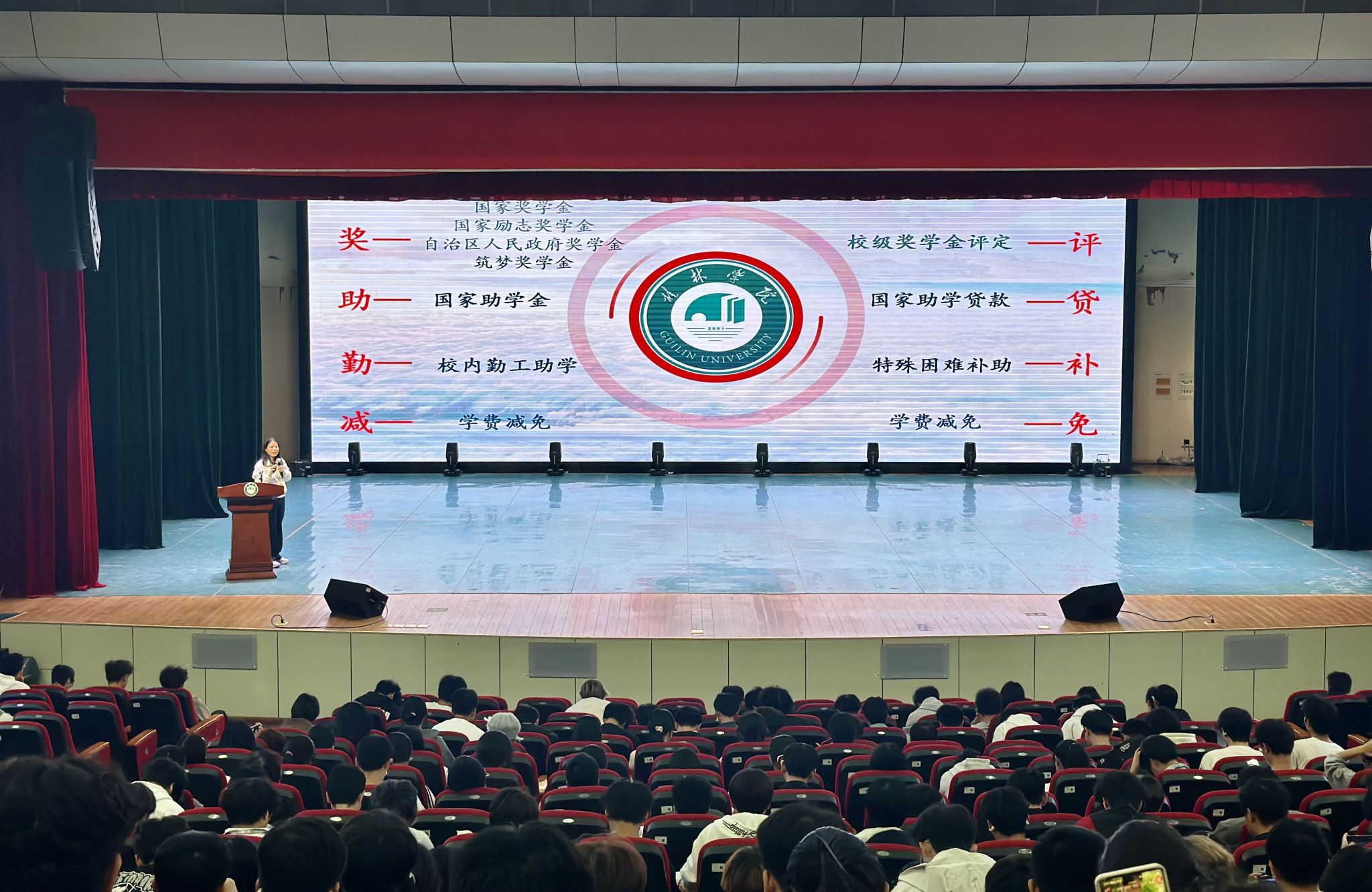 讲座上,首先聚焦“高校学生资助政策体系”,谢老师以“奖、助、勤、减、评、贷、补、免”八大关键词为脉络,系统梳理了各类资助项目的具体内容。她详细介绍了国家奖学金、国家励志奖学金、自治区人民政府奖学金及筑梦奖学金的申请条件与评审流程,解读了国家助学金的等级标准与认定方式,并就学费减免政策的适用对象、国家助学贷款的办理流程等学生普遍关心的问题作了说明。