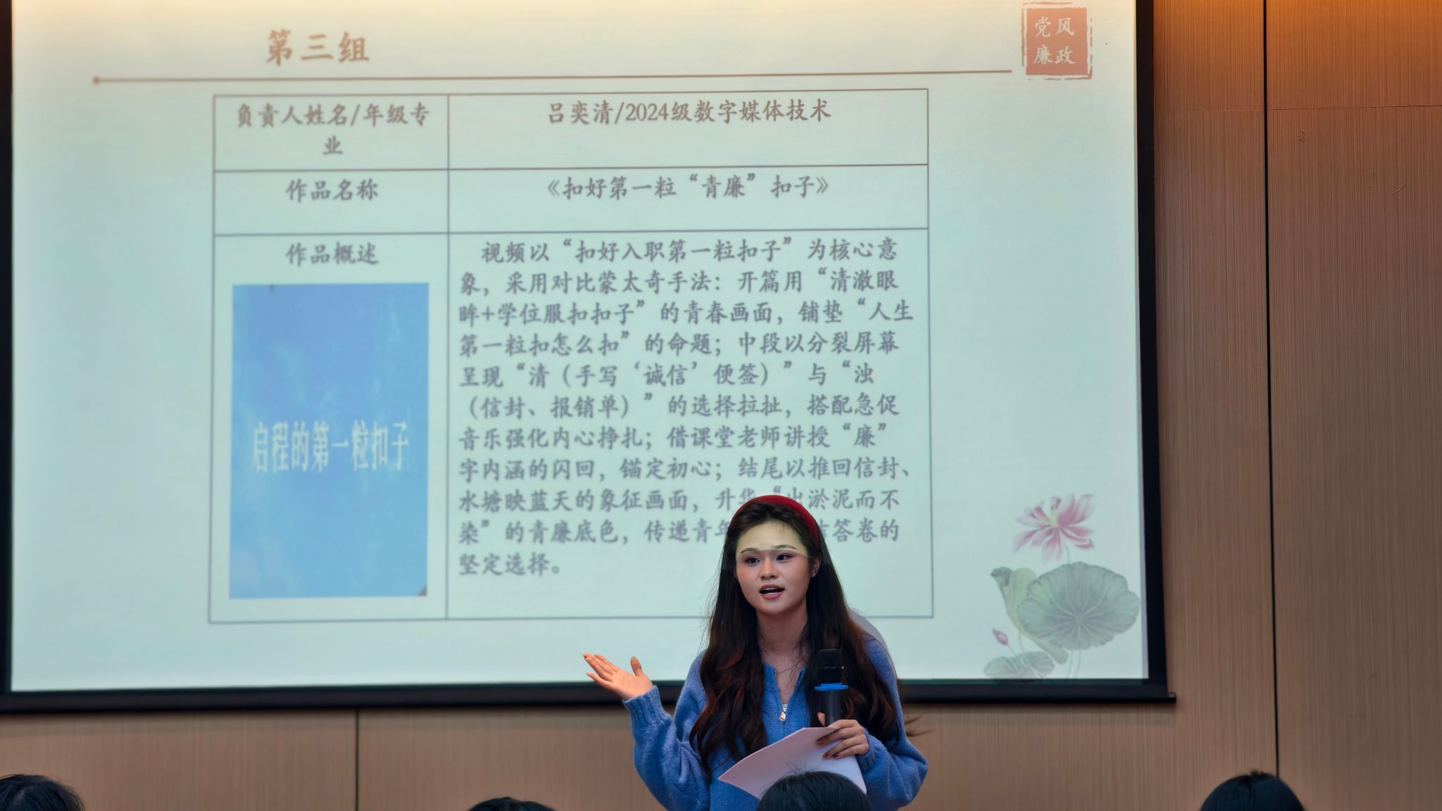 随后,进入紧张激烈的作品展示环节。各入围决赛的参赛小组依次登台,通过“阐述+展播”的形式,全方位呈现了他们的创作成果。在阐述环节,小组代表们精神饱满,逻辑清晰,详细介绍了视频的创意灵感、主题构思、故事脉络以及其中蕴含的廉洁深意。紧接着播放的微视频作品,更是精彩纷呈。这些作品题材多样,视角独特,有的聚焦历史先贤的清廉故事,有的演绎当代校园中关乎诚信、守纪的日常抉择,有的则通过生动的动画或深刻的剧情短片,寓言式地揭示廉洁修身的重要性。短短几分钟的视频,凝聚了同学们对廉洁文化的深刻思考与艺术表达,充分展现了信息工程学子蓬勃的创造力、扎实的专业技能和崇廉尚洁的价值追求。廉洁知识问答互动环节,现场观众踊跃参与,围绕党章党规、廉洁纪律、传统文化中的廉洁元素等知识点进行抢答。