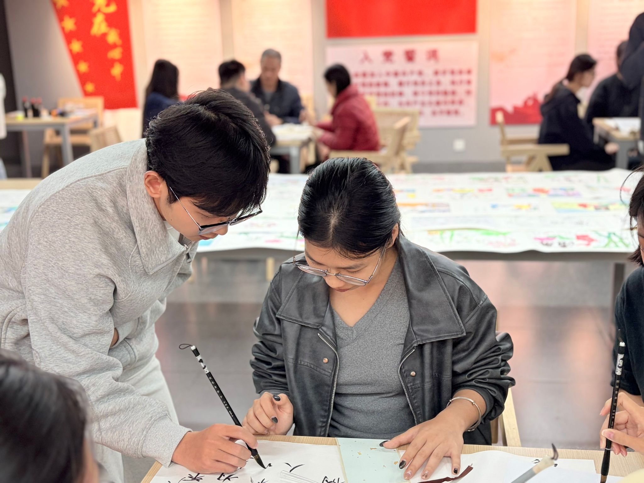 随后进入卷轴书写体验环节,参与人员自行组队投入创作,核心体验毛笔书写廉洁主题诗句的创作过程,创作现场墨香四溢,大家凝神静气手握毛笔,或书写“以笔绘廉”“以画传正”的活动主题,或挥毫“廉洁奉公”“两袖清风”等经典短句,每一笔起落都饱含对廉洁精神的敬畏,每一个字迹都承载着尚洁向善的追求,让毛笔书写的艺术魅力与廉洁主题的精神内涵深度融合。师生们在笔墨丹青间感悟廉洁内涵,传承清风正气。