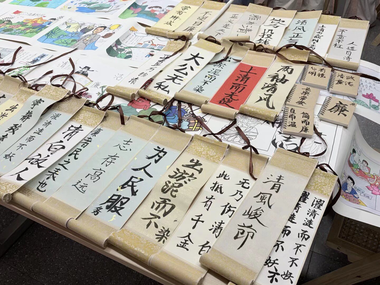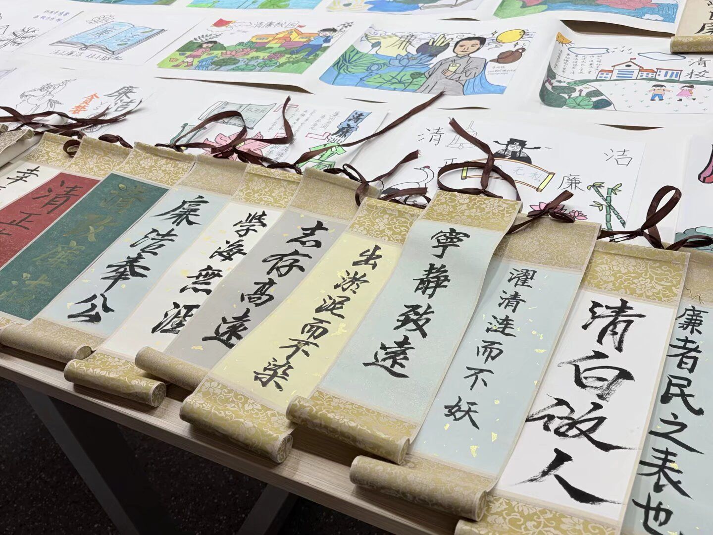 活动尾声,同学们纷纷展示书画卷轴,交流创作心得,现场气氛热烈而融洽。学生党员2023级数学专业韦天姿同学表示在本次创作实践中深化了对廉洁内涵的理解,增强廉洁自律意识,始终坚守初心、诚实做人。