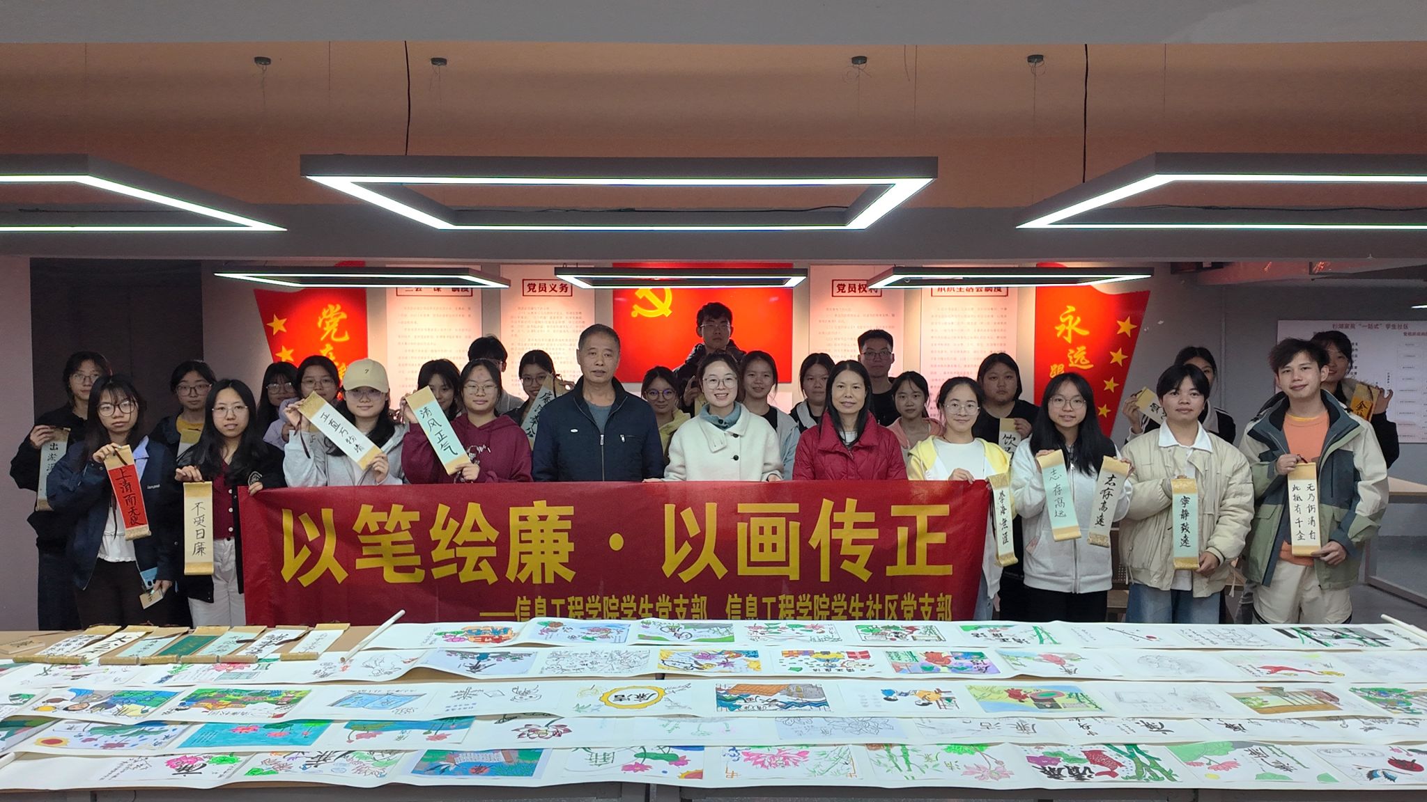 丹青吐秀,墨香传情。为深入推进廉洁文化建设,弘扬清风正气,将艺术创作与廉洁教育深度融合,营造崇廉尚洁的校园氛围,12月9日下午,信息工程学院学生党支部联合学生社区党支部在杉湖“一站式”学生社区党团活动中心成功举办“以笔绘廉,以画传正”廉洁书画卷轴现场创作活动。