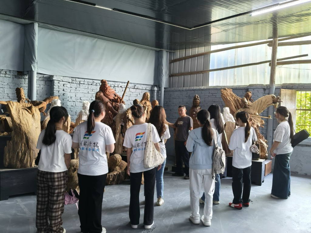 实践团还前往桂林象山区木雕工作室拜访了桂林木雕非遗传承人潘葵。采访中,潘老师分享了自身从模仿父辈到创新实践的历程,以及对“残缺美”的理解和木雕传承的展望。在潘老师的工作室,队员们既见到了以李叔同、鲁迅等名人为题材的传统木雕作品,其细腻刀法将人物神态、服饰纹理刻画得栩栩如生;也看到了充满创意的抽象作品——如用废铁结合灵感创作的独特雕塑,体现了艺术创新与环保理念的融合,让木雕在跨界中焕发新活力。此外,潘老师还讲述了创办工作室的初衷及未来推广计划,展现出非遗传承人的热爱与执着。队员们在观察作品、聆听构思中,深刻感受木雕“以刀为笔,以木为纸”的独特魅力与时代内涵。