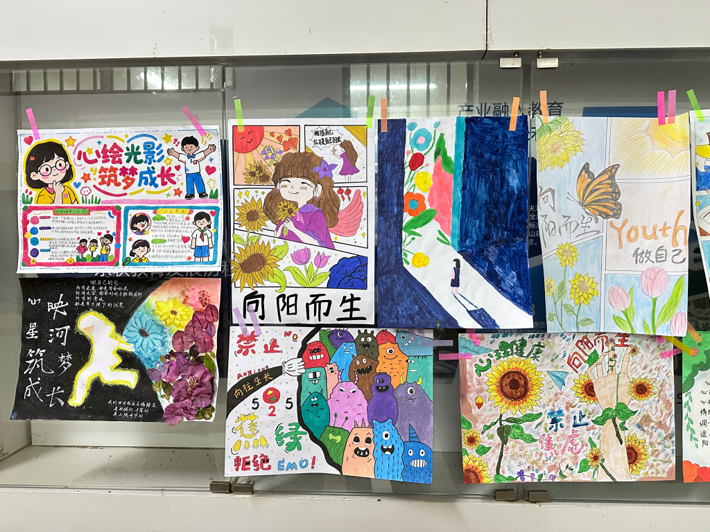 海报设计大赛自启动以来,便得到了同学们的热烈响应。同学们充分发挥自己的专业特长,将自己对心理健康的理解融入到一幅幅精美的海报中,每一幅海报都蕴含着同学们对心理健康的独特思考,展现出他们丰富的想象力和创造力。有的作品以明亮的色彩传递积极乐观的心态,有的则用细腻的笔触描绘出内心的情感世界。这些优秀作品在学院橱窗内进行了集中展示,吸引了众多师生驻足欣赏,成为校园里一道亮丽的风景线。