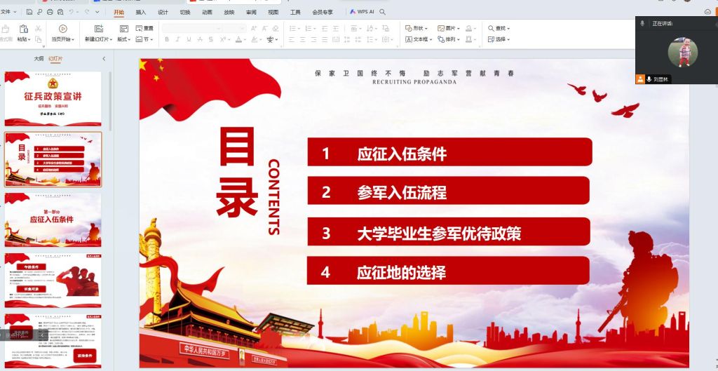 各毕业班辅导员利用周日晚例会,详细介绍大学毕业生“四个优先”的应征入伍条件、参军入伍流程、大学生参军优待政策、应征地报名选择等,特别是选择在桂林市的最新政策如带编入伍、入伍鼓励金、经济、就业、升学等方面的政策进行耐心的解读,并提醒学生关注学校通知,顺利参加征兵报名。最后,辅导员强调,参军入伍不仅仅是一种荣誉,更是一种责任,鼓励大学生积极响应国家号召,携笔从戎,应征入伍,磨炼意志,为国家国防贡献自己的青春力量。