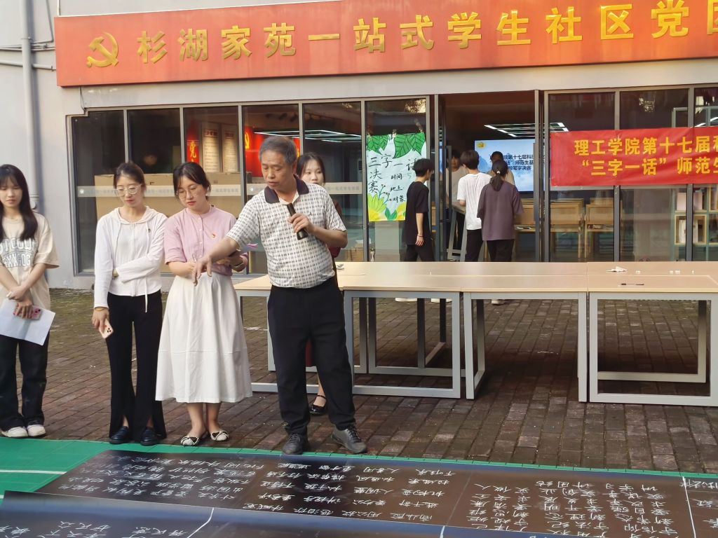 决赛中,选手们聚精会神书写粉笔字长卷轴,他们的书写内容合并起来是一首完整的《校园廉洁三字经》。活动承办单位理工学院学生党支部负责人介绍,本次活动将师范生“三字一话”基本功大赛与红色文化、廉洁文化相结合,旨在发挥党建引领作用,将思想政治教育融入学生职业技能培养,实现党建和教学的双融双促。