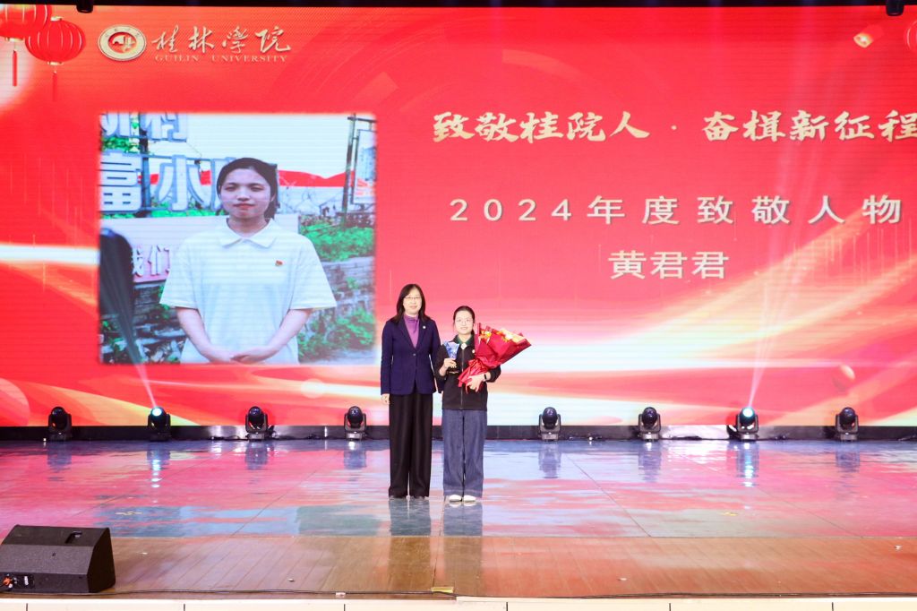 人文学院教师黄芳,教育学院教师蒋晓云、周杰,传媒与新闻学院学生黄君君,2020届校友廖健冰获评年度致敬人物,创新创业教育教师团队、马克思主义理论教学团队获评年度致敬团队,“桂林学院二期建设项目启动”“桂林学院参加全国第七届大学生艺术展演摄影类获一等奖”“理工学院学生党支部入选第四批‘全国党建工作样板支部’培育创建单位”获评年度致敬成果。