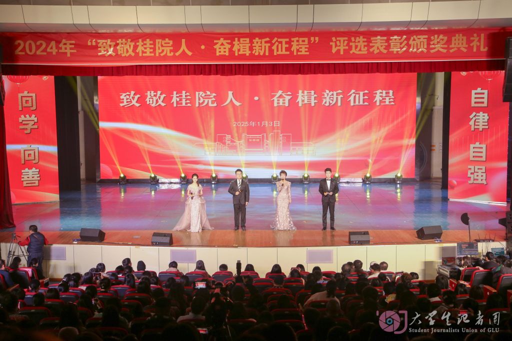 1月3日,学校2024年“致敬桂院人·奋楫新征程”评选表彰颁奖典礼在弘善讲堂举行,颁奖典礼表彰先进典型,向2024年取得的成就致敬,给奋斗的桂院人点赞,为做大做强桂林学院鼓舞士气、凝聚民心。学校董事长陶毅、校长吴郭泉、党委书记唐文红及全体校领导出席颁奖典礼,并为年度致敬人物、团队和成果颁奖。各二级学院、各单位师生代表共600余人参加了典礼。