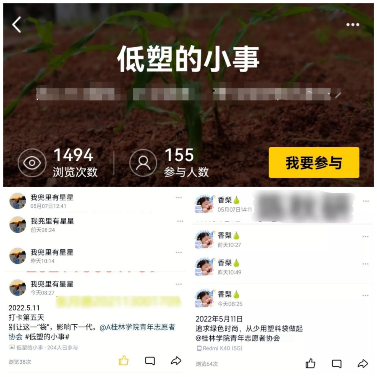 为大力倡导“低塑限塑、绿色生活”的科学理念,增强桂院学子的环保意识,树立正确的环境价值观,营造和谐优美的育人环境。校青协于5月7日至11日在校园内开展主题为“低塑的小事”的活动。在活动过程中,同学们在QQ空间带话题#10件低塑的小事,发布说说,打卡每日回收塑料的情况,或分享一句低塑生活格言,累计完成10件低塑小事或坚持连续7天分享低塑生活格言。举办本次活动,可以引导同学们关注低碳生活,营造更加“绿色”的校园环境,让同学们对低碳理念有了更深的了解,从身边的小事做起,为建设绿色校园出一份力。
