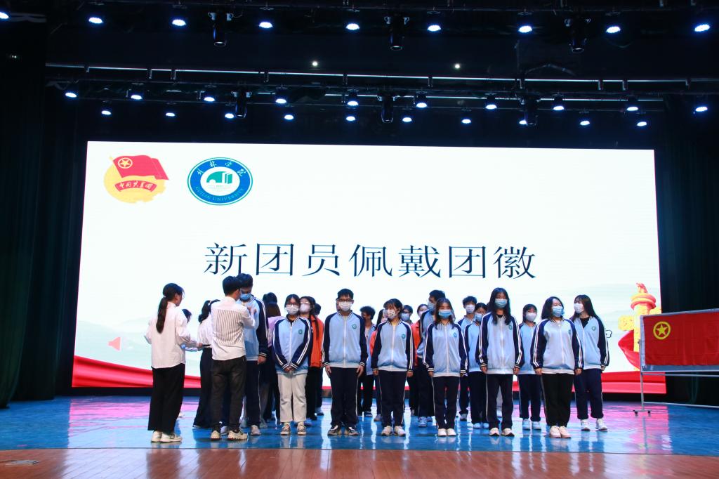随后,校团委老师们为新团员们佩戴团徽。面对鲜艳的团旗,新团员们举起右拳,以最洪亮的声音喊出最庄严的青春誓言。教育与音乐学院2021级学前教育专业的新团员代表曹静涵同学发言,她说:“今天,我们在团旗下郑重承诺,今后的时间里会不负韶华,不负时代,不负人民,以身作则,勤奋刻苦,做一个合格的共青团员。”经济与管理学院2019级金融学专业老团员代表林春玲同学代表发言,她鼓励新团员们担起肩上的责任,努力学习,不断进取,行动与思想都要加入到团的组织中去,将自己的青春力量贡献给团组织。