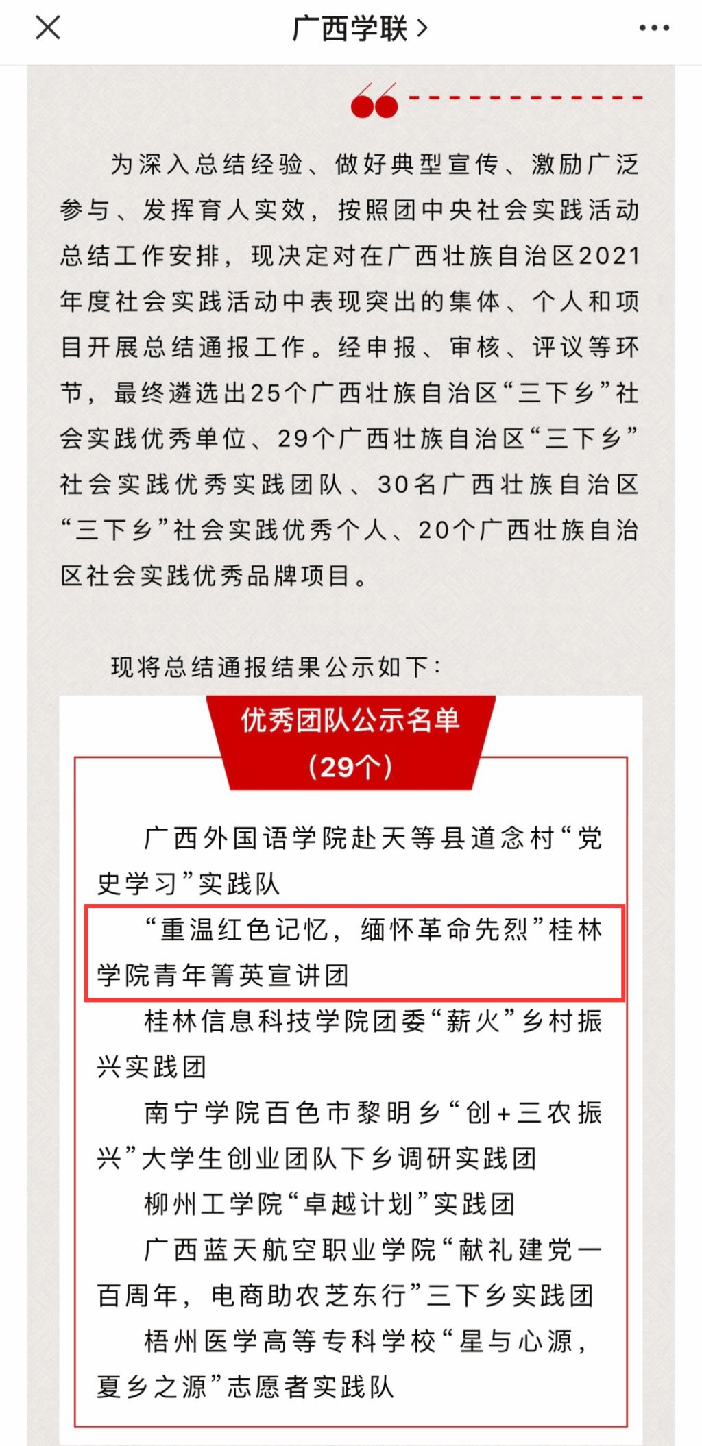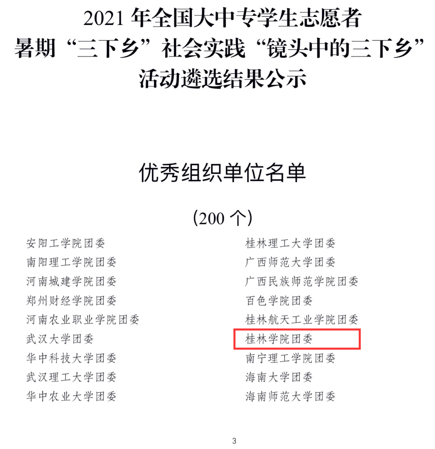 近日,从共青团中央青年发展部、中国青年报社、中国青年网、广西团区委传来喜讯,我校在2021年全国大中专学生志愿者暑期“三下乡”社会实践“镜头中的三下乡”活动遴选中荣获“优秀组织单位”、我校王瑞同志获全国大中专学生志愿者暑期“三下乡”社会实践活动“优秀个人”、我校“重温红色记忆,缅怀革命先烈”青年菁英宣讲团获“广西区优秀团队”荣誉称号。