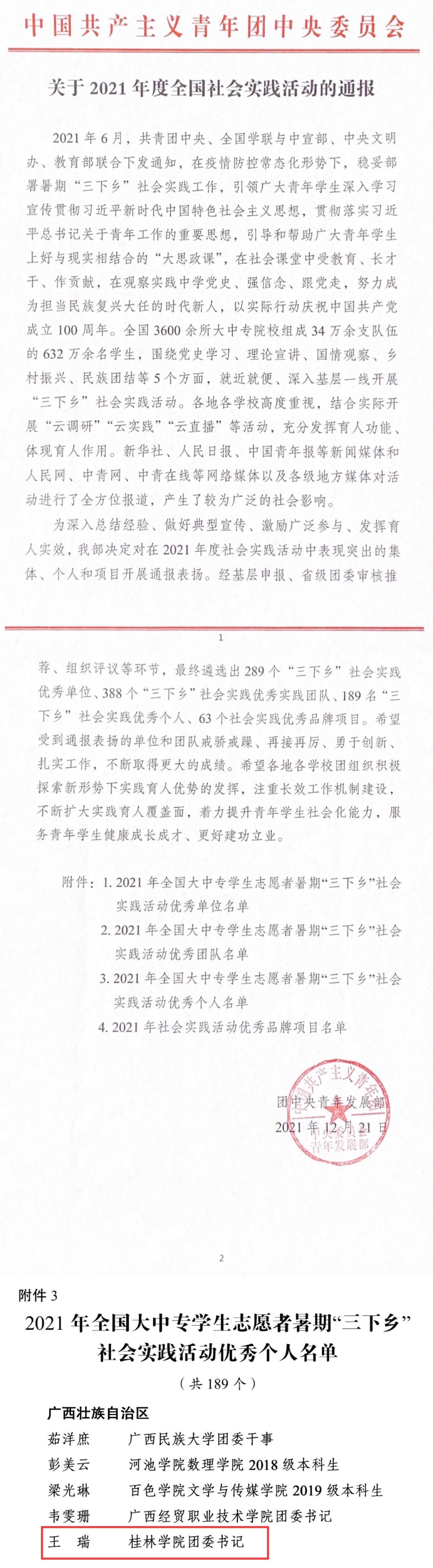 图为:王瑞同志获2021年全国大中专学生志愿者暑期“三下乡”社会实践活动优秀个人