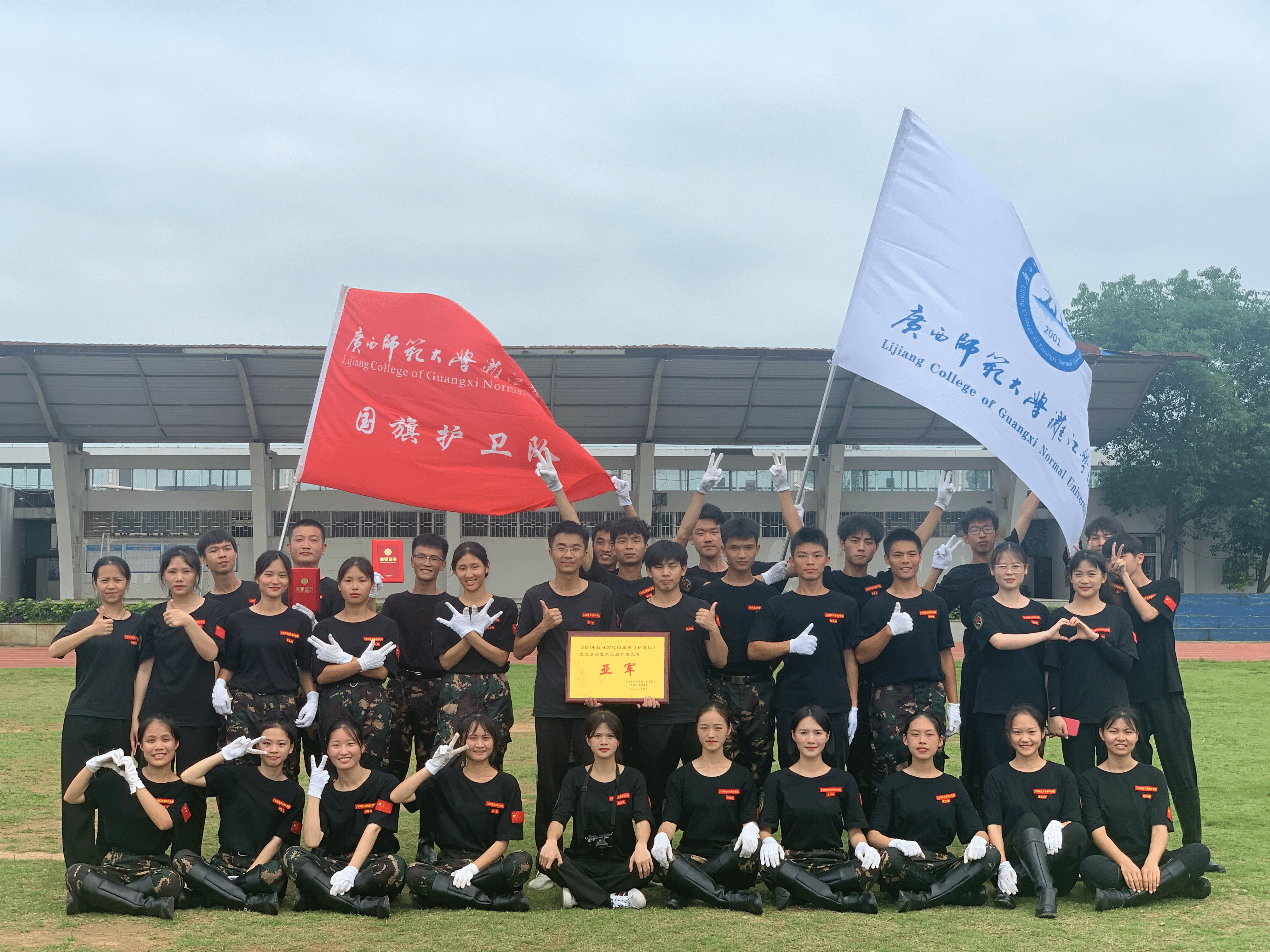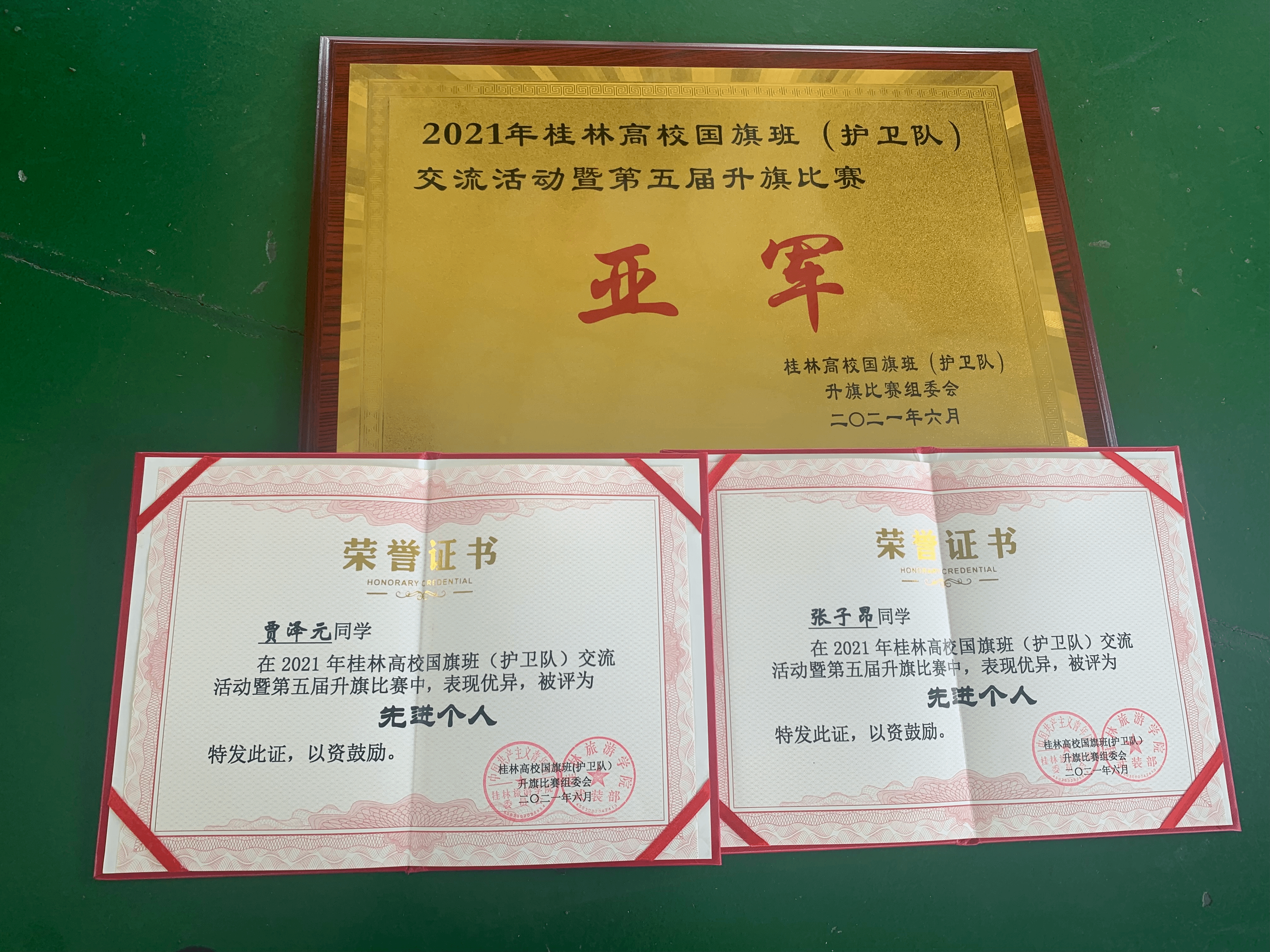 6月20日,桂林市高校国旗班(护卫队)第五届升旗比赛顺利落下帷幕,我校国旗护卫队表现出色获得团体组亚军。同时,19级汉语言张子昂、20级汉教贾泽元同学获得“先进个人奖”。