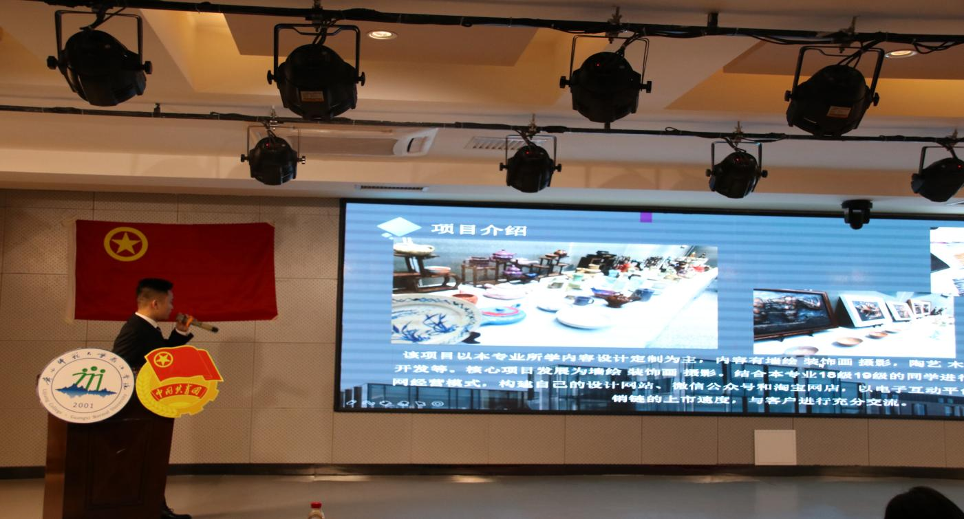 大会分为团队项目展示和老师提问答辩环节,此次活动参与的项目团队共有8个,各项目团队在五分钟的展示时间里,紧跟市场热点,就“DIY制作”,”职业礼仪“,“桌游市场”等一系列创意金点子进行介绍。