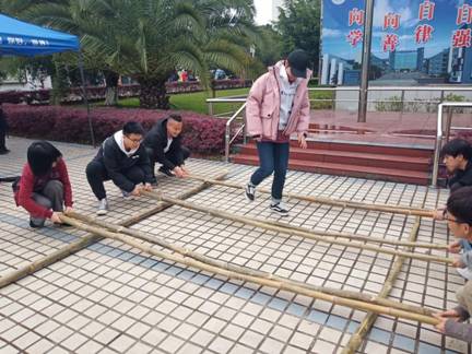 活动一开始直接进入壮族民俗问答环节。我们通过壮族民俗问答环节引导同学们进一步了解本民族的文化特色,传播壮乡文化。接着,有趣的竹竿舞体验活动尾随而至。竹竿舞是壮族特色的体育活动之一,是考验跳竿者的节奏感和反应能力。在工作人员的标准示范下,同学们听着竹竿敲打出的节奏感,也纷纷参与到活动中,体验着劳动人民载歌载舞的生活场景。最后,就到了以歌会友的山歌对唱环节。你来我往,嘿撩撩螺,同学们对的不只是山歌,更是一次情感的交锋碰撞。每当擂主出了新的歌题后,同学们都能迅速的应对,一首首娓娓动听的民歌余味无穷,似壮乡清秀的山水,热情的人民就在眼前。活动现场洋溢着浓烈的民族味,彰显了民族的自信与融合。