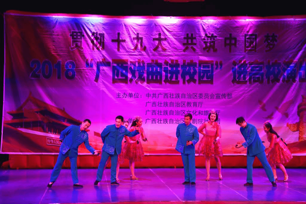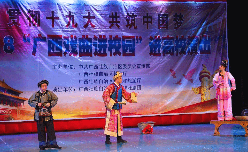 为弘扬中华优秀传统文化,展现艺术精华,切实提升当代大学生的艺术修养,11月25日晚,由自治区党委宣传部、自治区教育厅、自治区文化和旅游厅主办,广西壮族自治区戏剧院壮剧团承办的“贯彻十九大,共筑中国梦—2018“广西戏剧进校园”进高校演出活动”广西师范大学漓江学院专场在多功能报告厅举行。学生事务部副部长、校团委书记陈俊杰,校团委副书记蒋承良及各系学生代表一同观看演出。