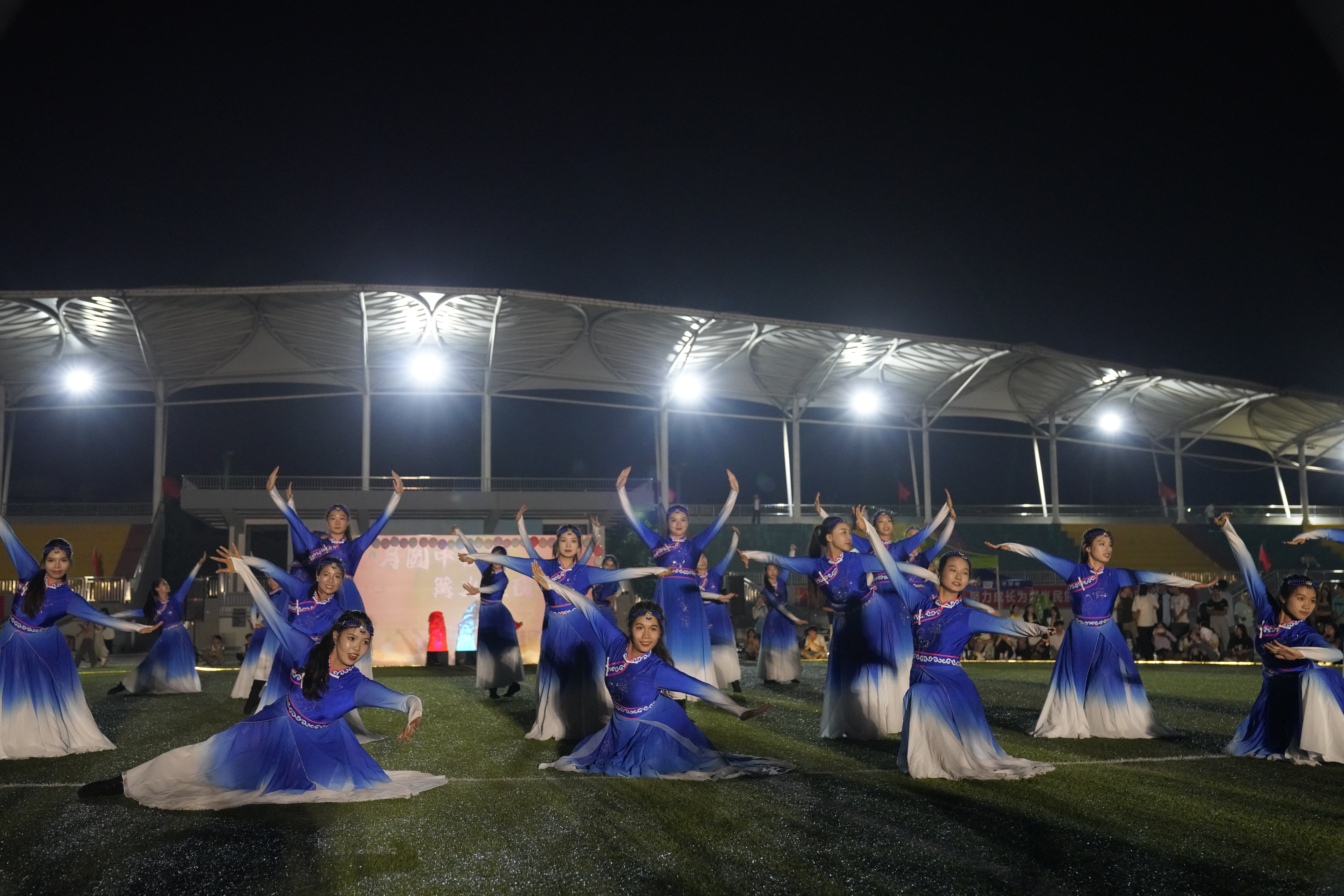活动的第一个环节是“游园妙趣,篝火狂欢”,通过弹瓶盖、眼疾手快、吹乒乓球等多个联动小游戏开启了中秋篝火晚会的序幕。当暮色渐浓时,随着操场上的电子篝火被点亮,篝火晚会正式开始。开场舞蹈《Boomfire》热闹的歌舞声唤醒了黑夜,充满力量感和艺术感的舞姿瞬间燃起了现场的气氛;节目《爱我中华》和《蓝色游吟》更是展现华夏之精神和中国舞蹈之美。在欢声笑语之中,同学们感受到了浓浓的欢乐气氛和桂院大家庭的温暖。最后,本次晚会在歌曲《仰望星空》中落下帷幕。