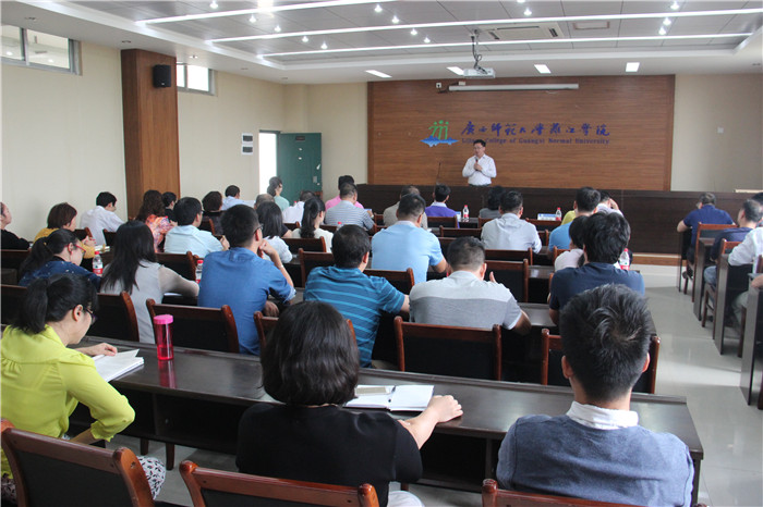 10月8日下午,我院中层干部会议在3301会议室召开,宣布广西师大党委关于学院领导任职调整的决定。广西师大党委书记王枬、组织部部长梁启谈,我院领导班子、全体中层干部参加会议。会议由我院院长周世中主持。
