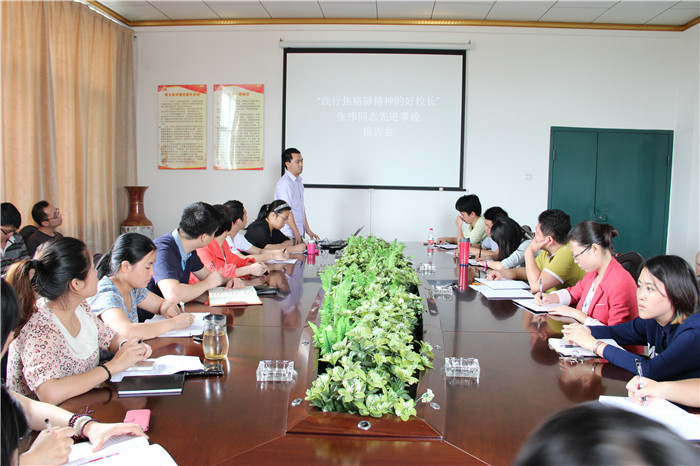 会议首先由管理系新入职辅导员王德彬老师讲述河南省郸城县秋渠一中校长张伟老师的感人事迹,王老师通过PPT演讲及视频新闻报道的展示方式,让教工党员了解张伟校长作为一个平凡的人在平凡的岗位上做出了不平凡的事。张伟是一位用生命铸就教育信仰的好校长;他用真情、真心、真诚换取了每一位留守学子的学习进步;他对学生无私奉献,对家庭却很是吝啬,他是我们践行党的群众路线的生动典范。