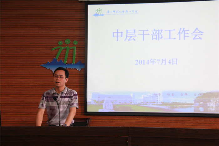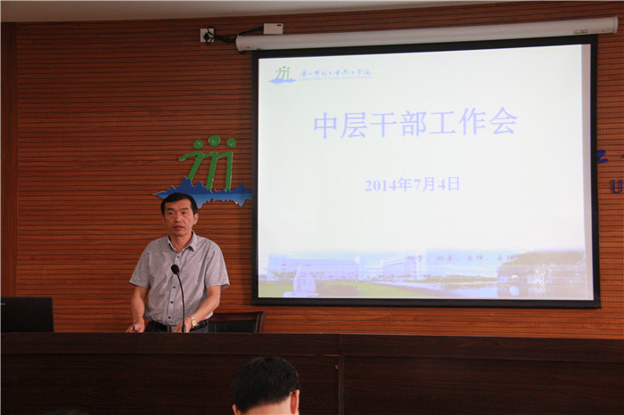 经过一个月的考核、选任、动议和竞聘等工作安排,学院2014年中管换届工作顺利完成,为有序推动换届中层管理干部之间的工作过渡,同时,总结本学期学院各项工作,学院于7月4日上午在3301会议室召开中层干部工作会,学院领导周世中、韦冬、邓志平、章冬兰、刘文革出席会议,换届后的全体中层管理干部参加了会议。会议由学院党委副书记、副院长邓志平主持。