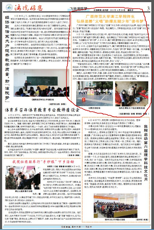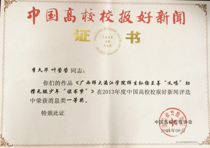 今年6月,中国高校校报协会公布了“2013年度中国高校校报好新闻”评选结果:学院报纸---《漓院信息》中的《广西师大漓江学院师生弘扬至善“义唱”助撑无腿少年“读书梦”》(作者:李久华 叶莹莹)荣获消息类一等奖。