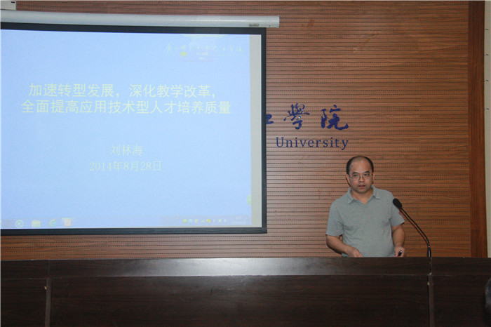 研讨会分两个阶段进行。上午,学院副院长刘林海作题为《加速转型发展,深化教学改革,全面提高应用技术型人才培养质量》的专题报告。他对当前普通高等本科学校转型发展进行了政策解读,他指出转型发展是学院的必然选择,也是学院可持续发展的必由之路。在总结分析我院转型经验的基础上,他提出几点意见:一要牢固人才培养的中心地位,深化教学改革,以质量提升为中心;二要稳定规模,优化专业结构,突出专业特色,提高专业建设水平;三是科学谋划人才培养的顶层设计,改造人才培养方案设计;四是创新人才培养模式,强调实践育人,推进校企合作;五是加强人生课程教育,改进教学方法,促进学生成才。