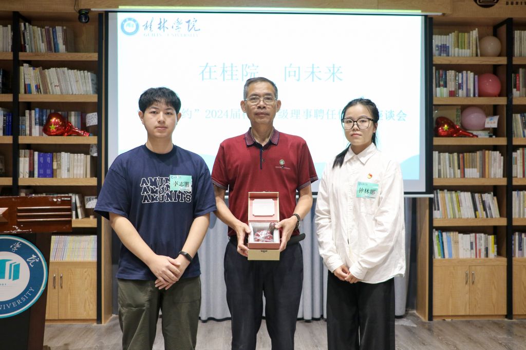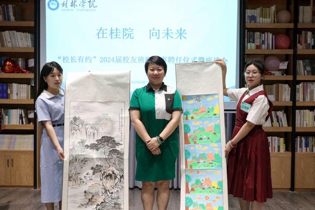 杨庆庆代表学校宣读了《桂林学院关于公布2024届校友班级理事名单的通知》。经二级学院推荐、校友会秘书处审核,共有2024届105名毕业生受聘为校友工作班级理事。各二级学院主要负责人为与会的2024届校友工作班级理事代表们颁发了聘书。来自城市设计学院、教育学院的校友工作班级理事代表向学校赠送了礼品。