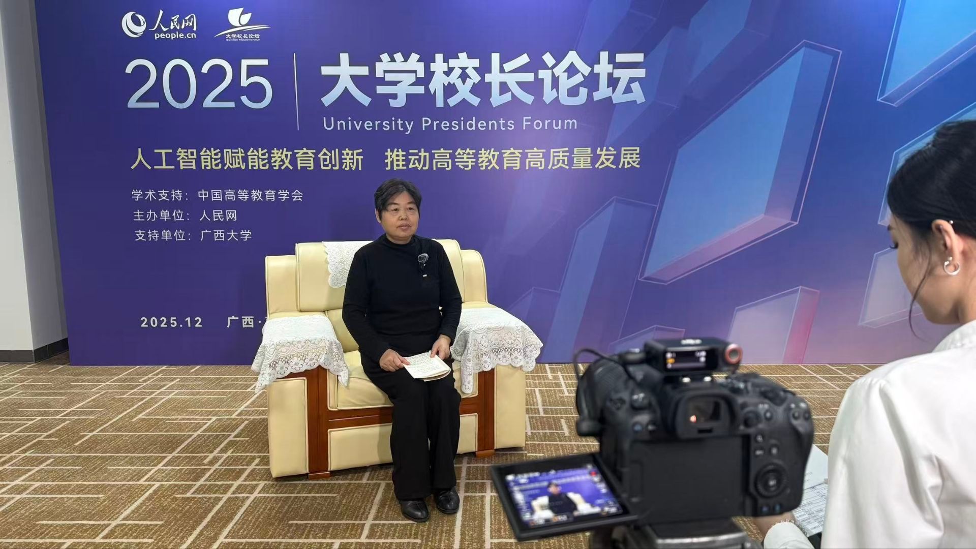 12月27日,以“人工智能赋能教育创新推动高等教育高质量发展”为主题的人民网2025大学校长论坛在广西大学圆满举办。桂林学院副校长何玲受邀参会,并接受人民网专访,向全国高校同行分享学校在人工智能与教育深度融合领域的实践成果与未来规划。