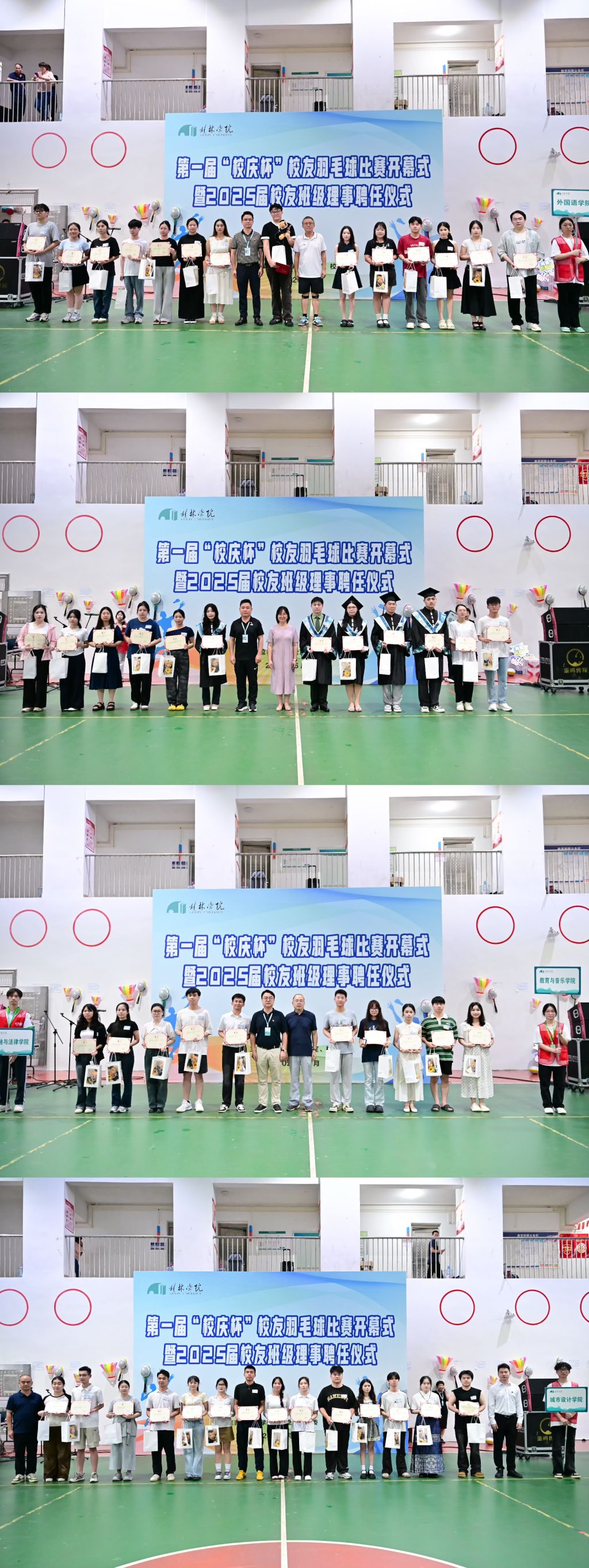 骄阳炽热,恰似同学少年风华正茂;草木葱茏,正如良师益友情谊绵长!6月18日下午,第一届“校庆杯”校友羽毛球比赛开幕式暨2025届校友班级理事聘任仪式在彰善楼室内球场精彩开幕。副校长蒋毅出席活动,各二级学院党总支书记、校团委书记,以及2025届校友班级理事代表、教职工羽毛球队代表、学生羽毛球队代表、学校桂林校友会羽毛球队代表等齐聚一堂。