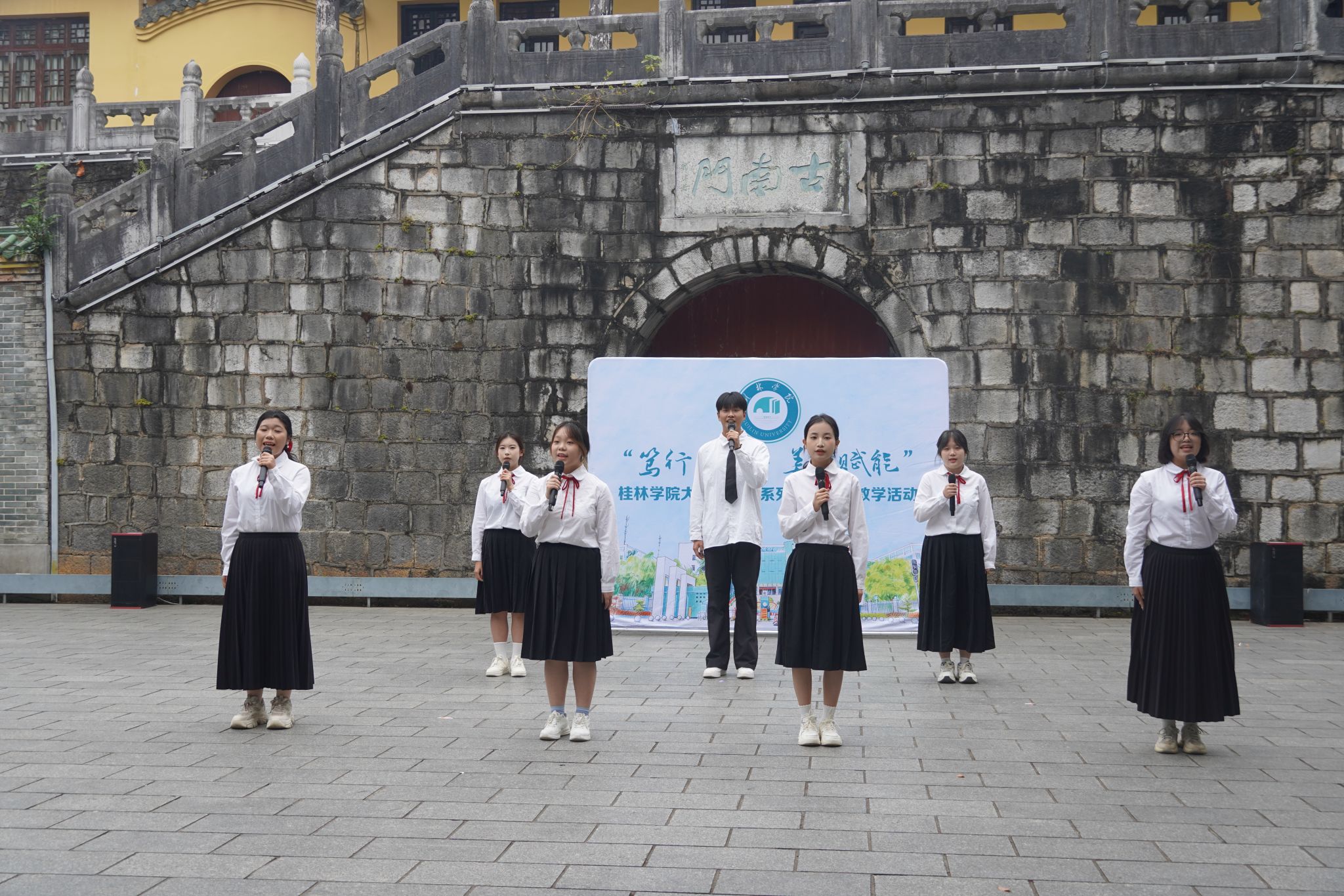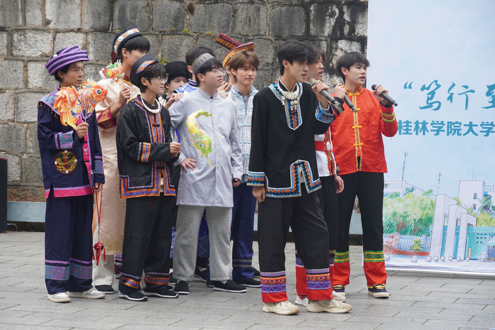 文艺展演环节亮点纷呈,同学们将课堂所学转化为兼具思想性与艺术性的舞台呈现:彩调剧《刘三姐》节选婉转悠扬,尽显桂风壮韵;集体朗诵《我爱这家园的莽莽苍苍》温情脉脉,传递思乡情感;爱国主义话剧《你记得我,我就活着》慷慨激昂,抒发家国情怀;广西世居民族服装展示搭配专业讲解,全方位展现八桂大地的多彩民族风情。沉浸式的表演让社区居民直呼“既熟悉又新鲜”,现场掌声与喝彩声此起彼伏。