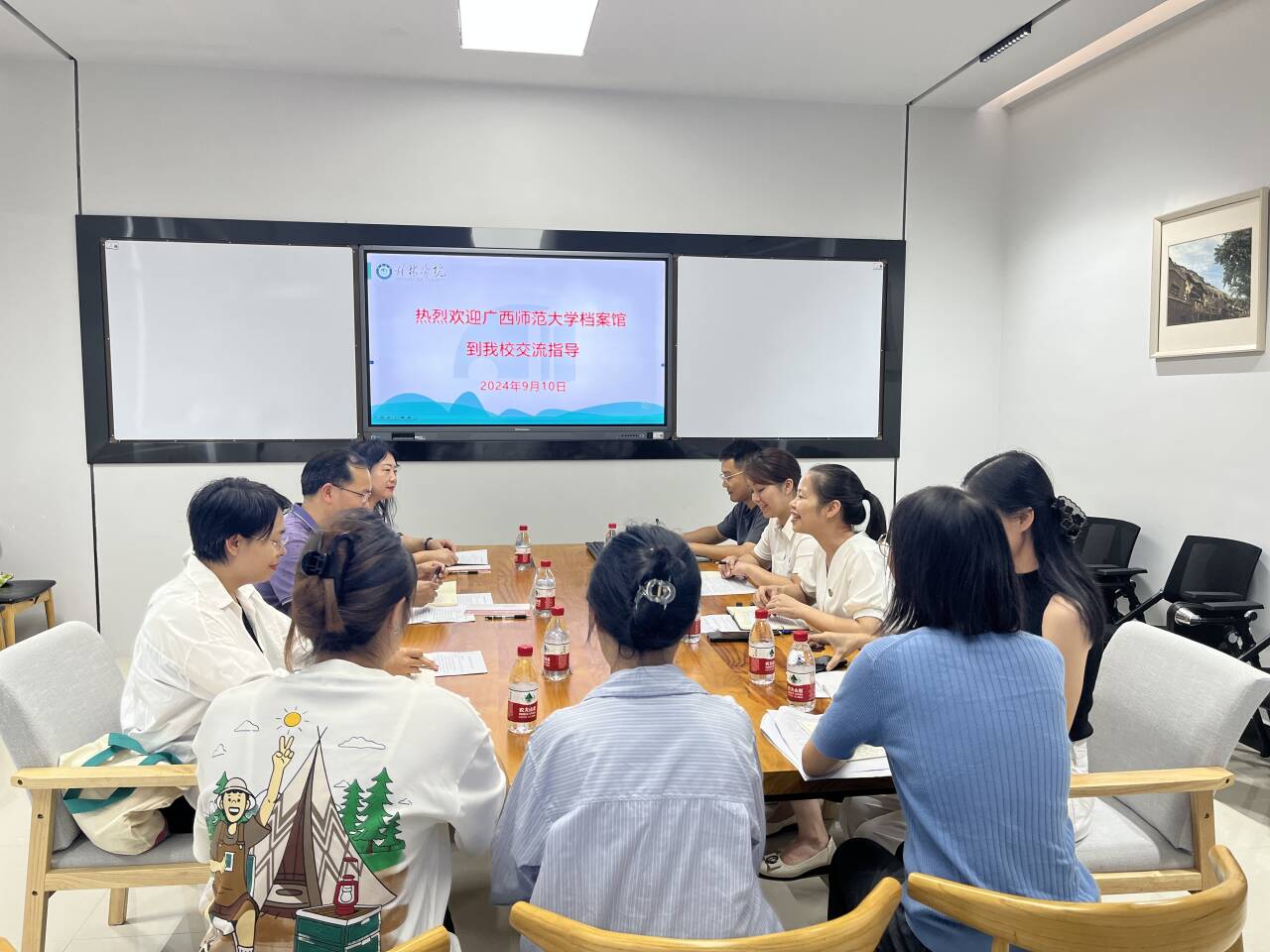 9月10日下午,广西师范大学档案馆刘朝文馆长一行3人到我校档案馆交流指导工作,图文信息中心负责人、档案馆全体人员参加了交流活动。