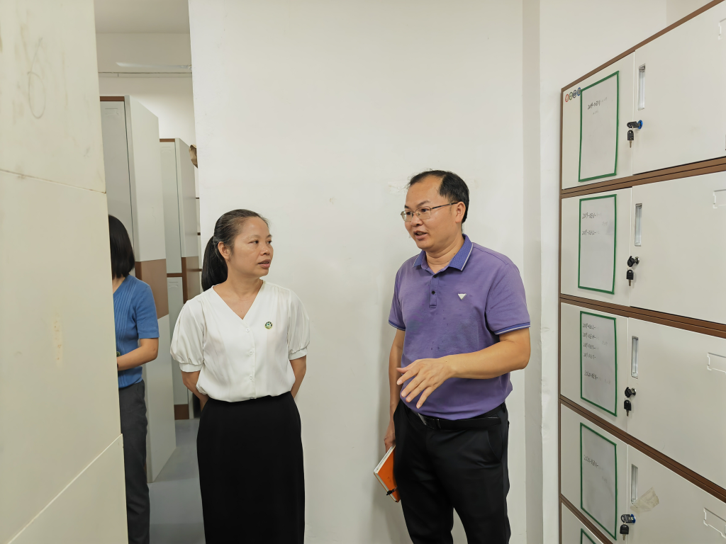 图文信息中心主任(左)与刘朝文馆长(右)在档案库房交流档案工作