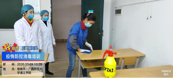 2020年3月9日上午,后勤保卫处组织医务人员开展校园环境清洁消毒培训工作。后勤保卫处副处长廖军兰、实验教学与网络信息中心副主任代国勇、桂林盛峰保洁绿化公司骨干人员参加了培训会。
