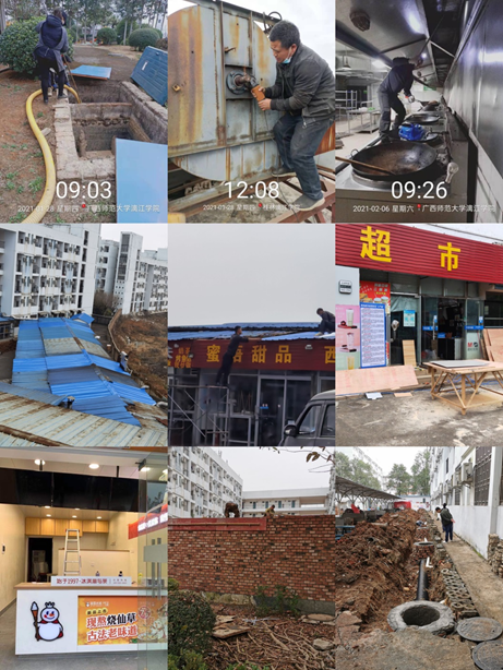 4.为了美化校园环境,商铺利用寒假进行店面整改及升级改造。鑫源超市及蜜雪冰城装修升级,校园商铺三角地带维修铁皮棚、传奇小吃店更换顶棚改造。寒假期间食堂进行抽油烟机维护清洗和排污管道维修、隔油池疏通清理, 组织食堂员工提前一周返校返岗清理餐厅和操作间卫生消杀工作,有序推进完成春季开学就餐筹备和防疫防控工作。
