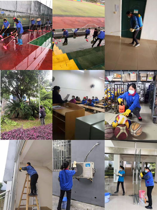 为创建环境优美、安静舒适、清洁卫生的文明校园,绿化保洁人员对校园进行全方位保洁工作,同时对地板、垃圾桶、厕所、教室、课桌椅等进行消毒打扫。