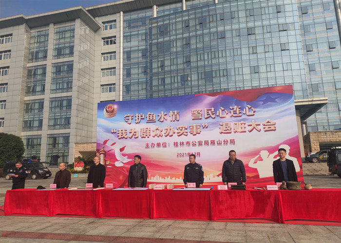 为深入学习宣传贯彻党的十九届六中全会精神,扎实推进“我为群众办实事”实践活动,回应人民群众新期待,展示公安机关打击违法犯罪工作成果,震慑犯罪,鼓舞士气,2021年12月21日上午,桂林市公安局雁山分局在雁山创业服务中心广场召开了“我为群众办实事”退赃大会,我校后勤保卫处秦家荣副处长、潘丞以老师、商贸与法律学院谭海练老师和30名学生代表参加了此次会议。