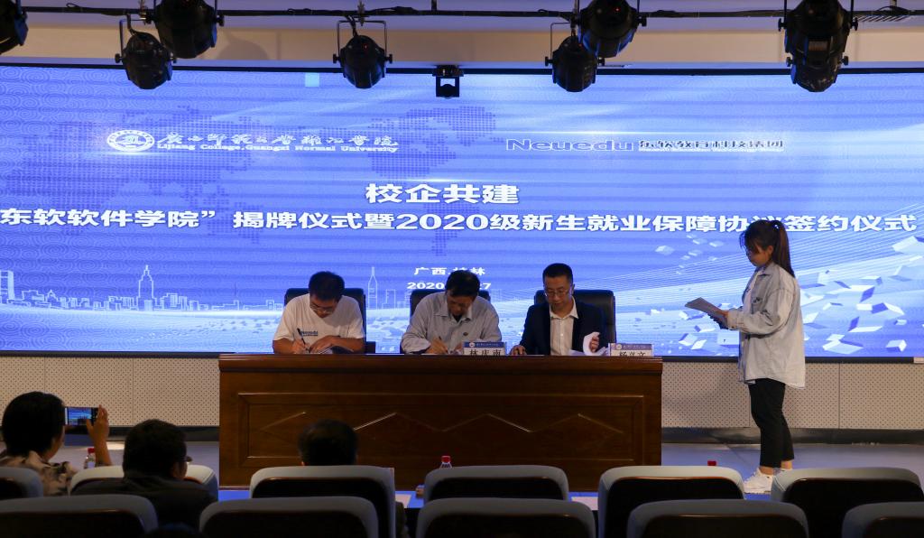 10月27日下午,我校与大连东软教育科技集团有限公司(以下简称“东软集团”)校企共建“东软软件学院” 揭牌仪式暨2020级新生就业保障协议签约仪式在至善讲堂举行。东软集团副总裁李印杲、东软集团华南区总经理杨义文、华南区销售总监乐杰、学校党委书记唐文红、副校长杨庆庆、学校相关职能部门负责人、东软集团相关部门负责人、理工学院教师代表以及2020级软件工程专业全体新生出席了签约仪式。仪式由合作发展处负责人秦丽芸主持。