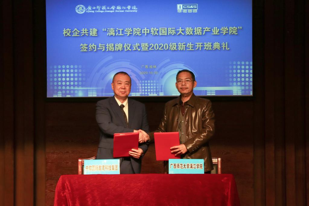 10月30日上午,我校与中软国际教育科技集团(以下简称“中软教育集团”)校企共建“漓江学院中软国际大数据产业学院”签约与揭牌仪式暨2020级新生开班典礼在学校小音乐厅举行。中软国际执行董事、高级副总裁、中软教育集团董事长唐振明、中软教育集团信创业务总经理关海涛、中软教育集团华南区总经理张航,桂林经济技术发开区党工委委员、管委会副主任黄锦堂,学校董事、校长杨树喆,校党委副书记、纪委书记、副校长邓志平,以及中软教育集团各区域经理、我校相关职能部门负责人、理工学院领导班子、教师代表和2020级数据科学与大数据专业全体新生出席签约仪式。仪式由校党委副书记、纪委书记、副校长邓志平主持。