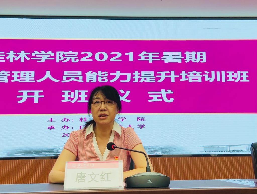 7月31日上午,学校2021年暑期基层管理人员能力提升培训班在广西师范大学育才校区国际交流中心举行开班仪式。学校党委书记唐文红出席开班仪式并讲话。
