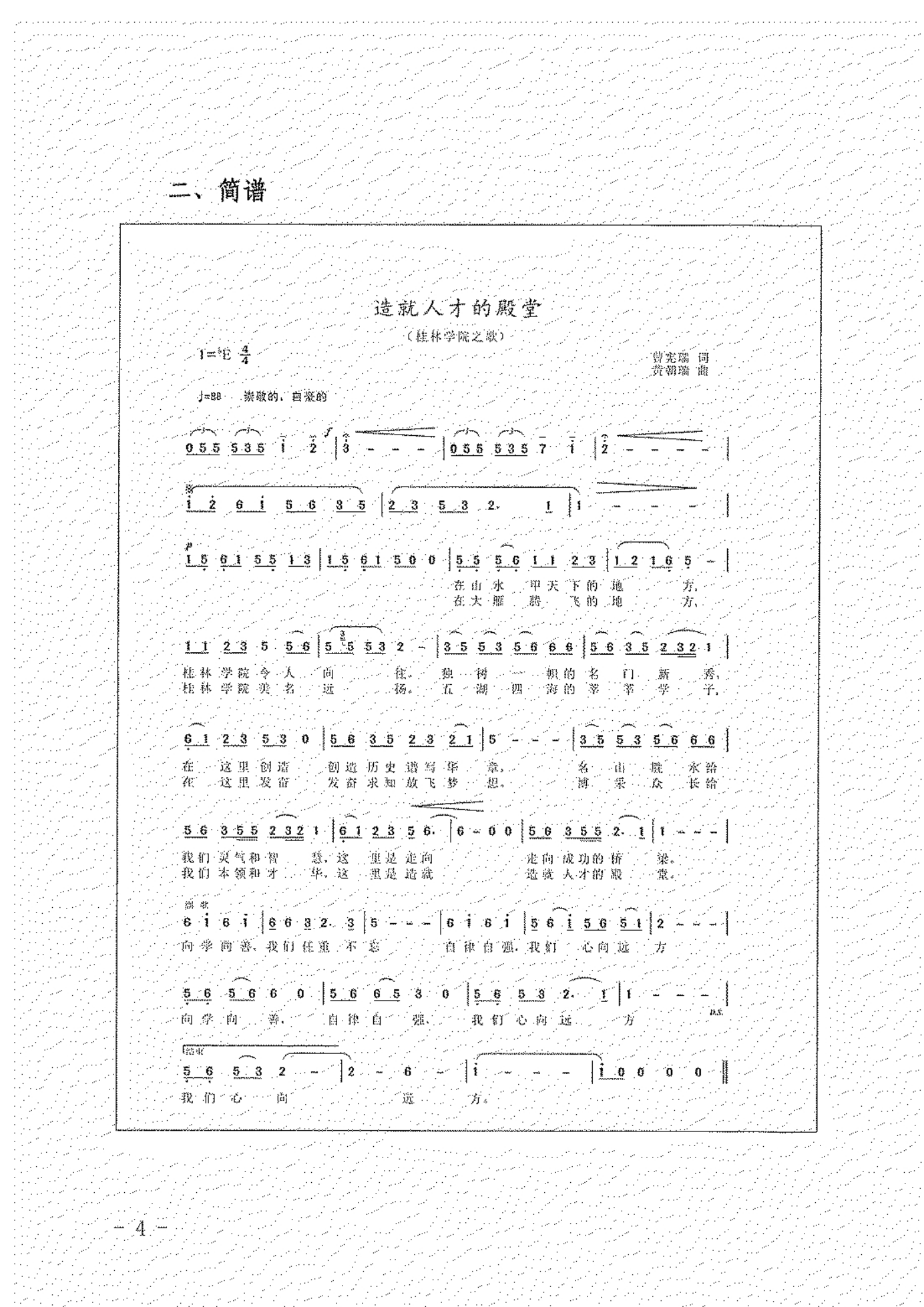 《通知》指出,由曾宪瑞作词、黄朝瑞作曲的《造就人才的殿堂(广西师范大学漓江学院之歌)》,自2014年被确定为广西师范大学漓江学院校歌以来的广泛传唱中,逐渐被广大师生认可,随着广西师范大学漓江学院获批转设为桂林学院,根据广大师生的意见和建议,同时征得原词作者同意,对部分歌词作了修改完善,更名为《造就人才的殿堂(桂林学院之歌)》,并确定为桂林学院校歌。