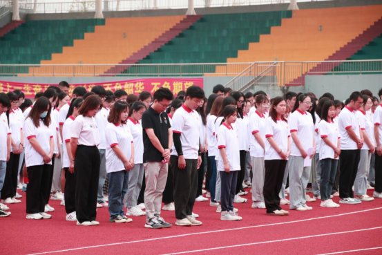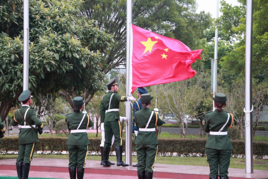 国旗护卫队的同学踏着铿锵有力、整齐庄严的步伐,护送五星红旗入场,随着一声清脆的口令,三名队员整齐地走上升旗台。当国歌响起,全体师生肃立注目,伴随着雄壮的国歌,鲜艳的五星红旗冉冉升起,迎风飘扬。之后,全体师生面向国旗肃立默哀,深切悼念和缅怀逝去的革命先烈。