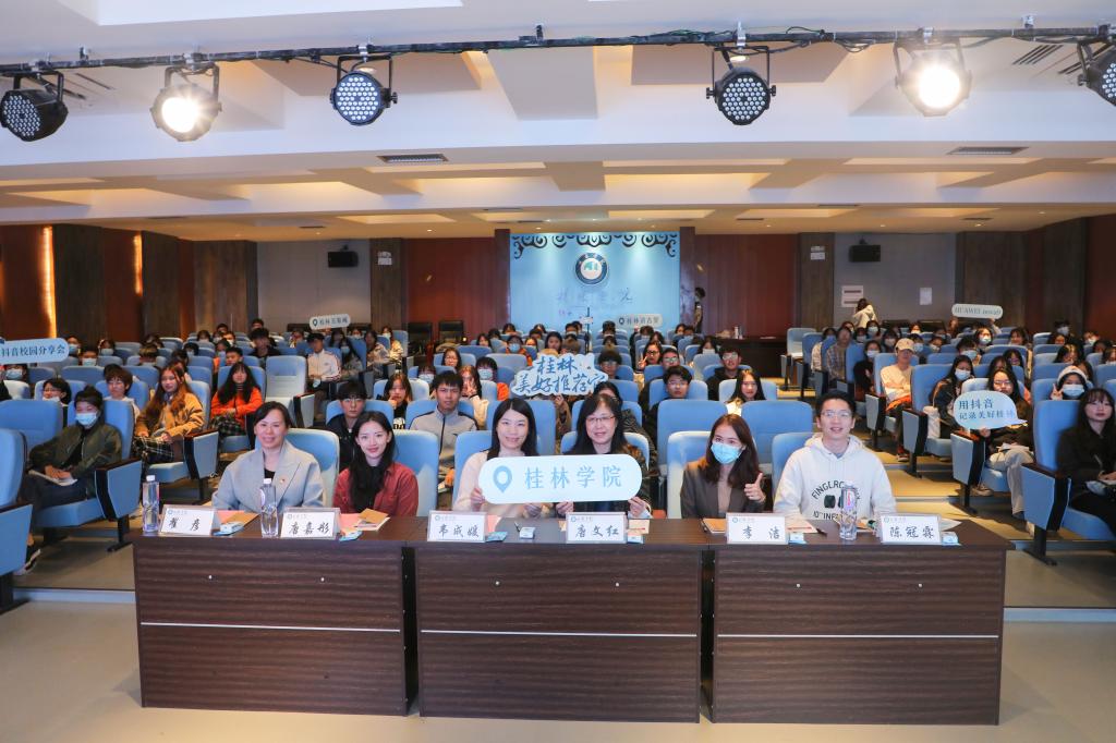 10月21日下午,由广西壮族自治区文化和旅游厅、共青团广西壮族自治区委员会、共青团桂林市委员会、桂林旅游发展总公司、桂林旅游股份有限公司共同发起的“桂林美好推荐官”话题活动在我校至善讲堂进行线下推广,我校团委承办了此次抖音校园分享会活动。校党委书记唐文红出席并致辞,共青团广西区委四级调研员韦成媛,广西学联驻会执行主席雷婷、颜奕桐,共青团桂林市委学校部负责人唐嘉彤及抖音广西区域相关负责人、我校相关职能部门负责人、各二级学院团总支书记、学生代表参加活动。