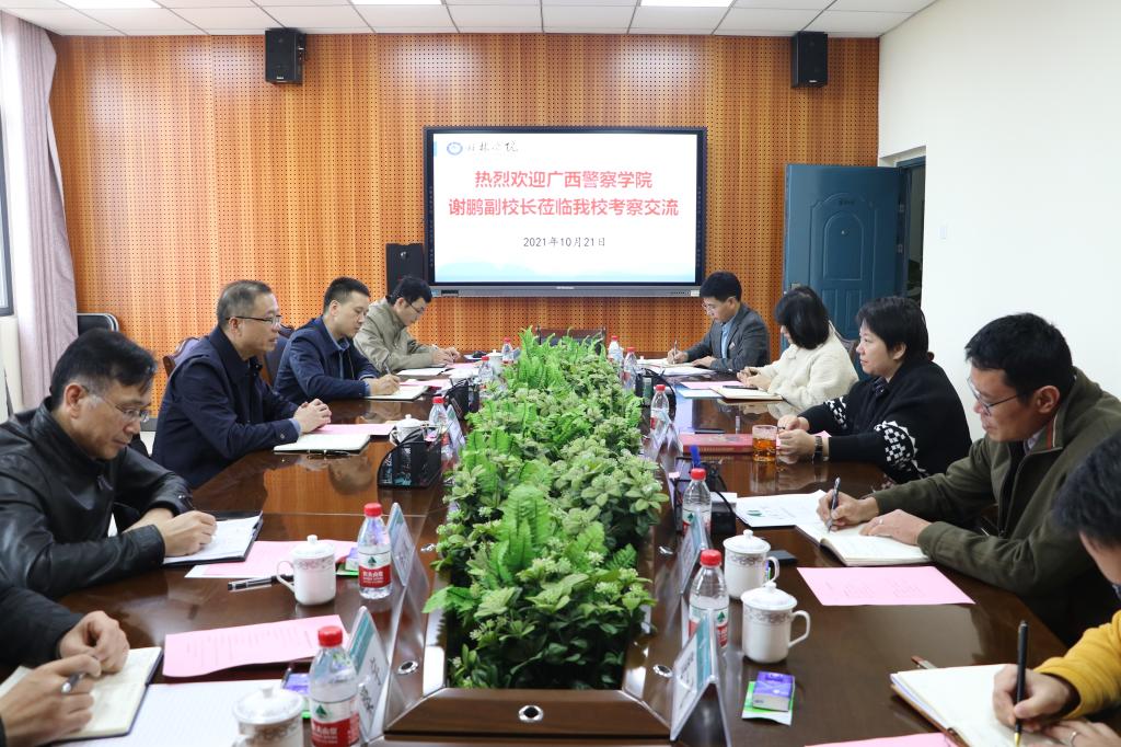 10月21日下午,广西警察学院校党委委员、副校长谢鹏一行5人来我校考察交流,校党委委员、副校长、校工会主席杨庆庆热情接待了谢鹏副校长一行,并在知善楼8315会议室主持召开了座谈交流会。教学科研处、合作发展处、党政事务部相关负责人参加考察交流活动。