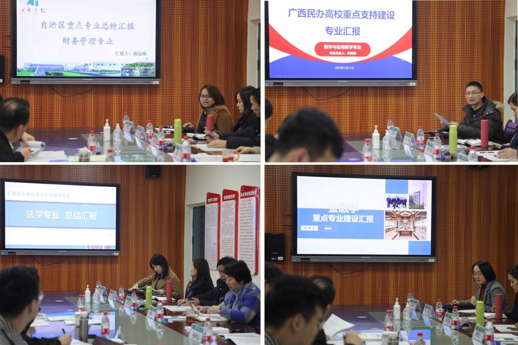 杨庆庆代表学校从人才培养方案、师资队伍建设、教学经费投入、质量保障体系等四个方面汇报了四个重点专业建设总体情况。各专业负责人分别从专业建设目标、下拨资金及配套资金使用、项目实施成效、问题或建议等方面进行具体总结汇报。自2018年立项建设以来,坚持以应用型人才培养为主线,从培养方案、师资队伍、课程体系、教学条件和培养质量等层面加强建设。立项建设期间,四个重点专业共引进新教师21人,共有14人晋升为副教授职称,副教授职称总体占比例位居学校各专业前列;建成相关实验实训室8间并投入使用,极大的改善了教学基本条件,有效的保障了应用型人才培养目标的达成;财务管理、数学与应用数学、金融学等3个专业入选自治区级一流本科专业建设点立项,法学专业入选校级一流专业建设点立项。其中,法学、金融学专业通过校企合作开展“法律实务知行班”“金融实务班”,率先启动校级“拔尖-至善”卓越人才培养计划,探索并实践高素质应用型人才培养模式改革;财务管理专业积极开展“1+X”书证融通教学改革,形成了“产教学赛研创”六位一体的实践教学体系;数学与应用数学专业依托校内实验实训条件,持续开展“以赛促学”,在全国大学生数学建模竞赛中获二等奖,系广西民办高校唯一,学校获得广西赛区优秀组织奖。