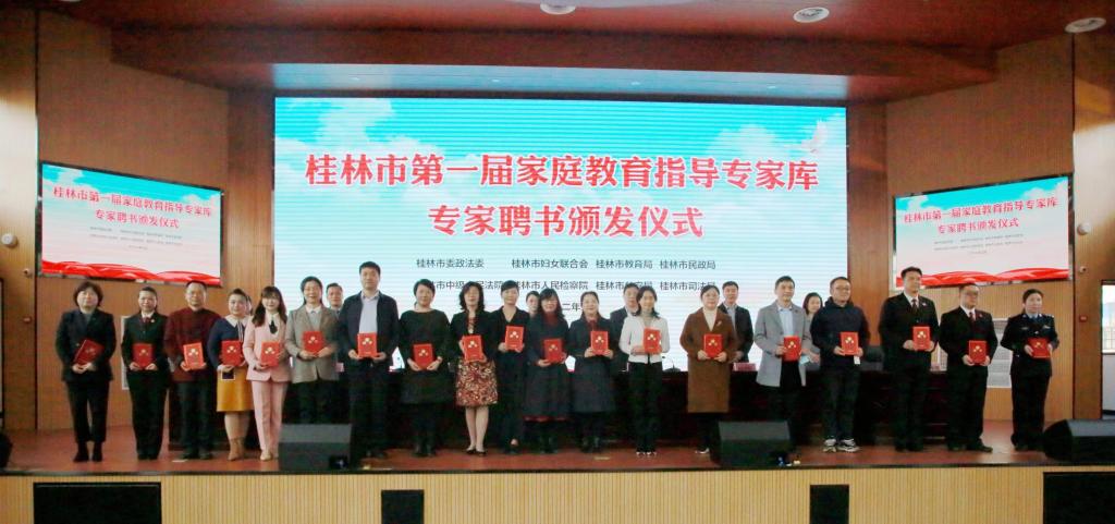 3月7日上午,桂林市学习贯彻落实《家庭教育促进法》系列活动在桂林市青少年法治教育基地举行,我校副校长杨庆庆获聘为桂林市第一届家庭教育指导专家库专家。市委政法委、市妇联、市教育局、市民政局、市中级人民法院、市人民检察院、市公安局、市司法局、市婚调委、市救助站、市法律援助中心、市妇儿活动中心、市和谐心理学校、各大专院校和社会志愿服务组织等单位100多人参加活动。