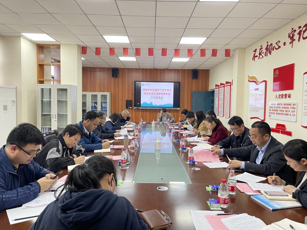 会议指出,本次自治区教育厅委托广西高等学校设置评议委员会专家组对我校转设过渡期工作进行中期检查的内容包括:(一)师资队伍建设情况;(二)教学与科研水平情况;(三)基础设施建设情况;(四)教学经费投入和保障情况;(五)学科专业建设和人才培养质量情况;(六)内部治理情况;(七)母体学校逐步退出办学情况;(八)安全稳定情况;(九)国家高评委实地考察提出的整改事项和学校承诺事项推进落实情况。专家组进校实地考察程序为:召开汇报会,听取学校负责人对照检查汇报;专家组检查学校有关材料,对照检查指标逐项考评;实地考察学校办学条件和基础设施建设情况;专家评议,形成专家组实地考察基本意见;专家组反馈意见。实地考察时间初定于2022年4月7-15日。