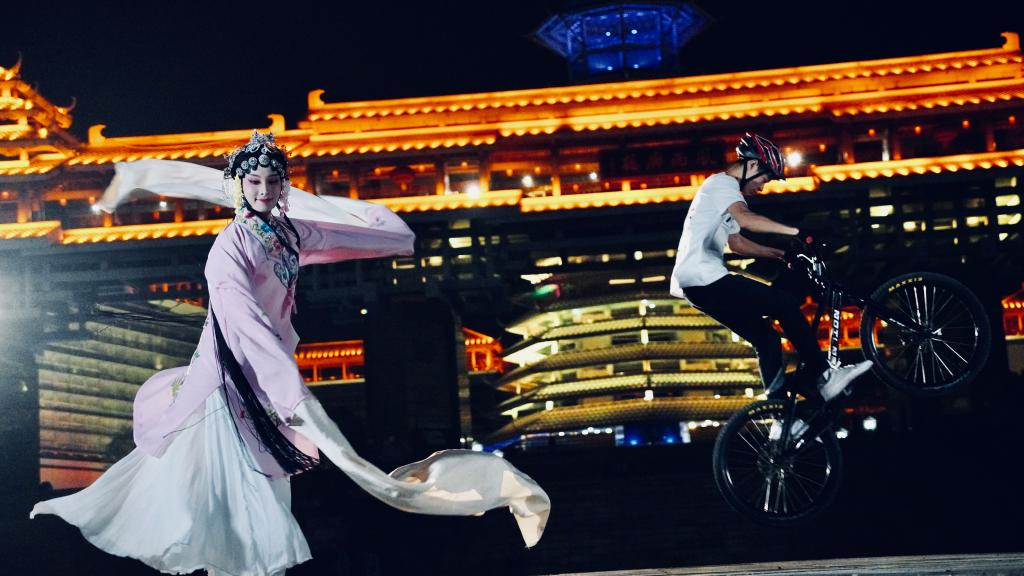正值习近平总书记2021年视察广西一周年之际,桂林市发布最新文化旅游宣传片《秀甲天下 世界桂林》,该片通过《悦观•山水》《史话•山水》《乐享•山水》《光舞•山水》四个主题解读桂林经典的山水文化,勾勒出一幅桂林攻略性旅游手册,画面唯美大气,为桂林打造世界级旅游城市强势助力。我校商贸与法律学院2019级学生何亮润作为参演人员,在“光·如霓”一段中表演了自行车特技foot jam tail whip,与桂剧演员一同在“一院两馆”的夜色下向世人们展现出桂林的光影烂漫。