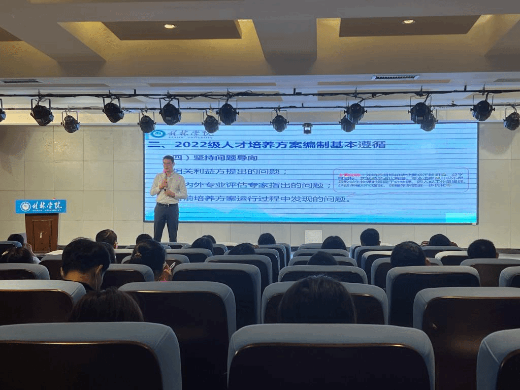 教学科研处处长杨杰夫作了题为《2022级本科专业应用型人才培养方案编制专题培训》的报告。他从2022年版指导意见编制背景、2022级人才培养方案编制基本遵循、2022级人才培养方案编制基本思路和要求、2022级人才培养方案编制基本工作要求等四个方面对《桂林学院关于编制2022年版本科专业应用型人才培养方案的指导意见》进行解读,明确培养方案编制工作的指导思想、基本原则、基本思路和要求。