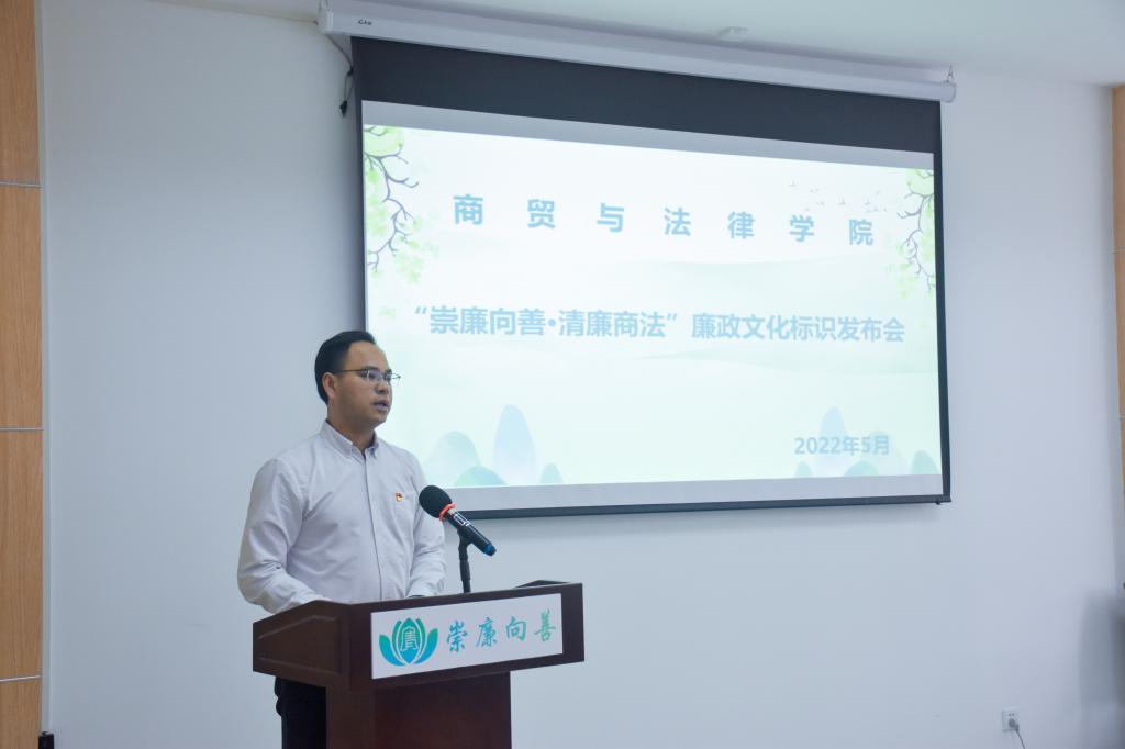 5月18日下午,我校商贸与法律学院在图书馆c馆三楼会议室举行“崇廉向善·清廉商法”廉政文化标识发布会,校纪委负责人、副校长邓志平出席会议,党政事务部相关负责人,商贸与法律学院党总支班子成员、教师党员及学生代表参加会议。