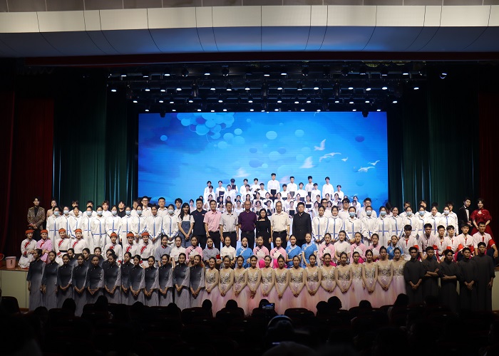为了迎接党的二十大胜利召开,深入贯彻落实党的十九届中央历次全会精神,6月20日,我校教育与音乐学院联合广西师范大学音乐学院共同举办以“喜迎二十大 颂歌献给党 同筑中国梦”为主题的音乐艺术党课。学校董事长周道林、党组织负责人唐文红因公务未能到达现场,但对此次党课的举办予以热情的关怀和祝贺,给了现场师生很大的鼓舞。广西师范大学音乐学院党委书记周飞、副书记钟景清率部分师生到场参加了本次音乐党课,我校学生事务部、后勤保卫处、商贸与法律学院、经济管理学院相关负责人,教育与音乐学院领导班子成员和部分师生在艺术党课现场观看。